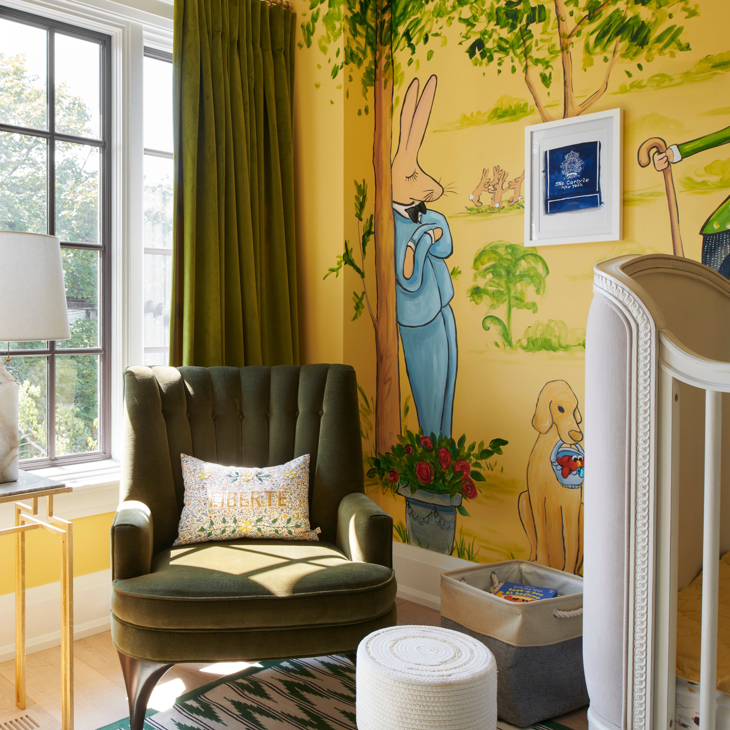 When our little Pierce arrived, I immediately felt he had an old soul and an old world charm. I’ve always loved The Carlyle Hotel on the Upper East Side of Manhattan, with its rich pedigree and history. Opened in 1930, the hotel was designed by Dorothy Draper, in Art Deco style and named after Scottish essayist Thomas Carlyle. It’s iconic piano bar features a murale by Ludwig Bemelman, who is famous for the Madeline series of books. The murale features scenes from Central Park and bunnies drinking martinis and puffing on cigars. It’s playful while also grown up and cheeky. For me – we shouldn’t take ourselves too seriously – and that’s what this murale represents – whimsical magic!